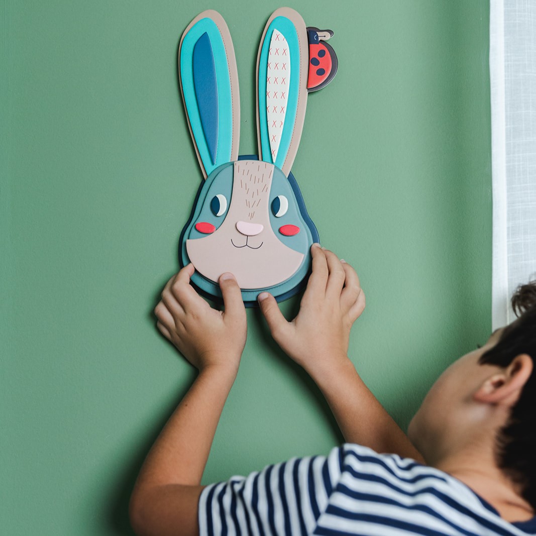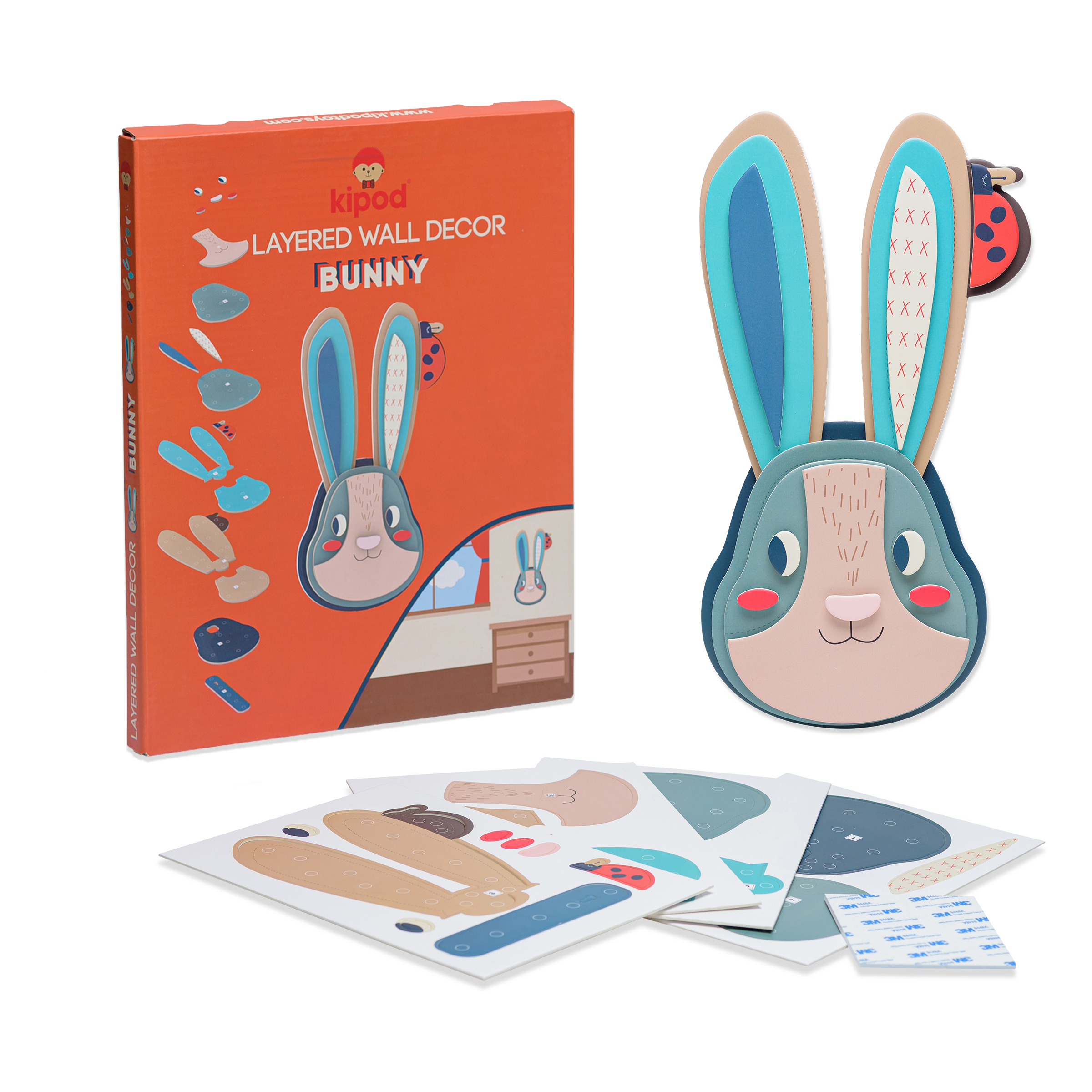 مجموعة تركيبية لصنع أرنب تُعلّق على الحائط ، باستخدام ملصقات طبقية تُلصق على قطع كرتون مطبوعة بشكل خاص وجميل .